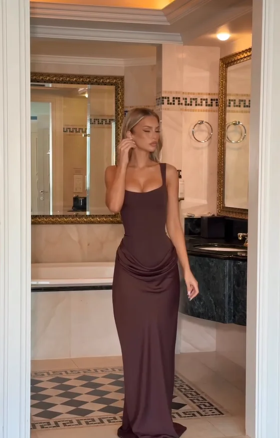 Solid Pleated Sling Dress Women Square Neck Sleeveless Off-shoulder Waist Cinching Slim Dresses Lady Evening Party Gowns 2025